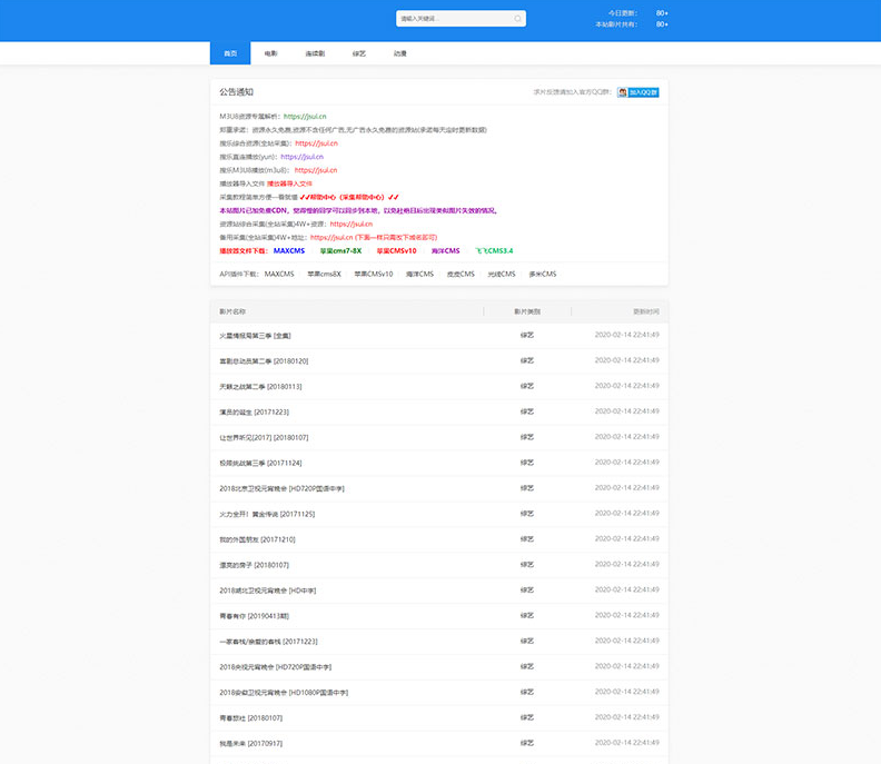 简洁蓝色风格苹果cmsV10影视资源站源码 电脑+手机模板下载地址:https: